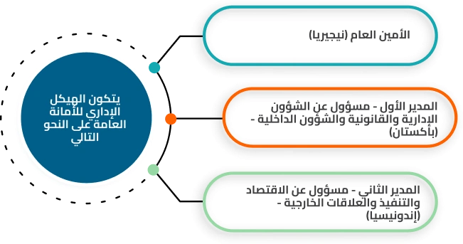 ويُعتبر الأمين العام – بوصفه كبير الموظفين الإداريين في المنظمة- مسئولًا عن جميع أنشطة المنظمة. ويضطلع بواجباته على مدى فترة ولاية مدتها ثلاث سنوات غير قابلة للتجديد.