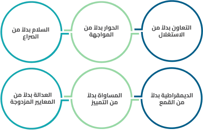 - السعي لإرساء وتطوير الشراكة التنموية التكاملية بين الدول العربية من جهة، والمشاركة العادلة لكل فئات المجتمع وشرائحه في جهود التنمية وثمارها داخل كل دولة من جهة أخرى، لما في ذلك من انعكاسات إيجابية ومباشرة على ترسيخ السلام والازدهار والاستقرار في هذه الدول، وفي العالم بصفة عامة.